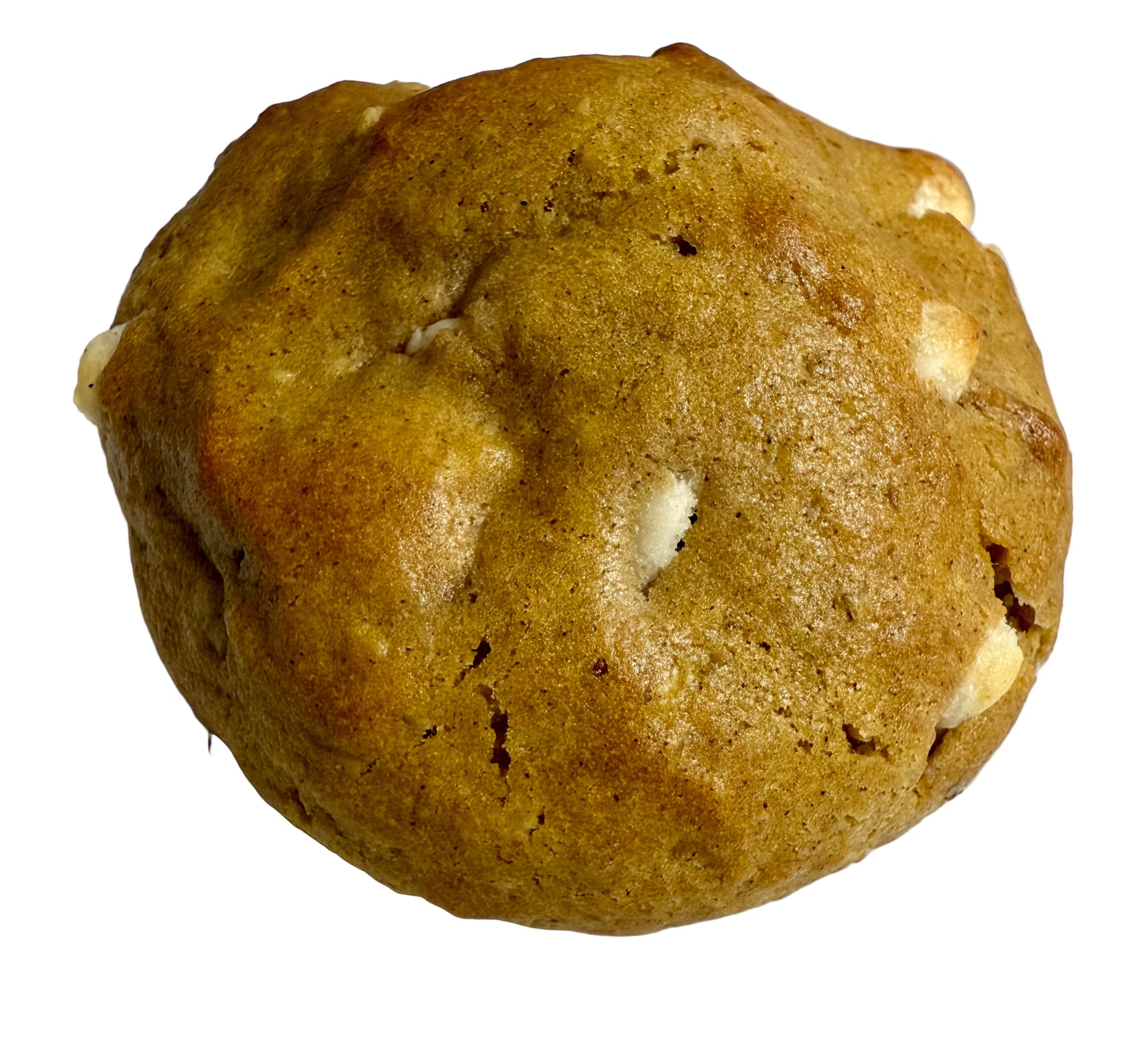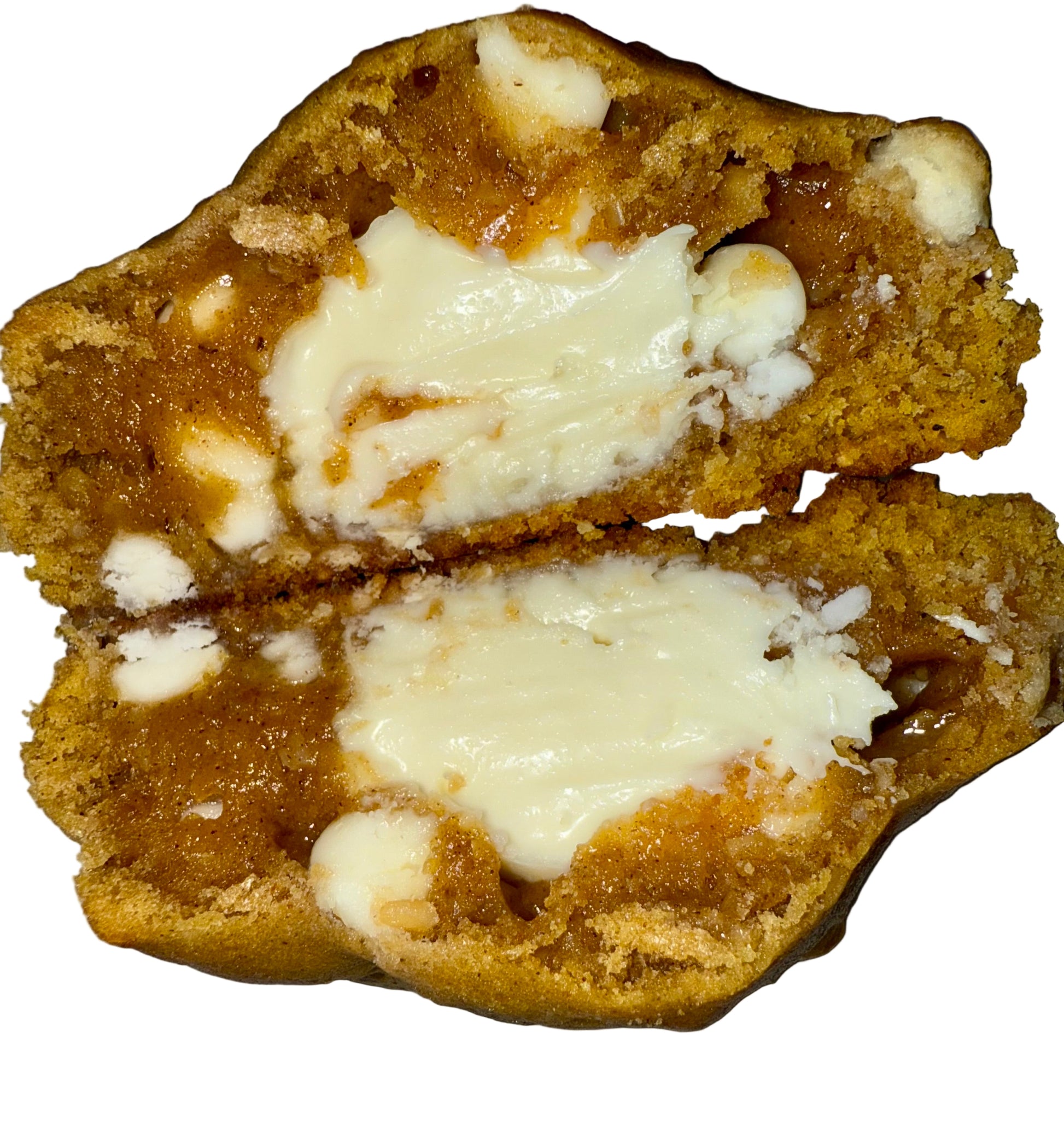 Pumpkin oatmeal cookie dough with white chocolate chips warmly spiced with pumpkin spice and maple syrup, with a white chocolate cream cheese chips filling.